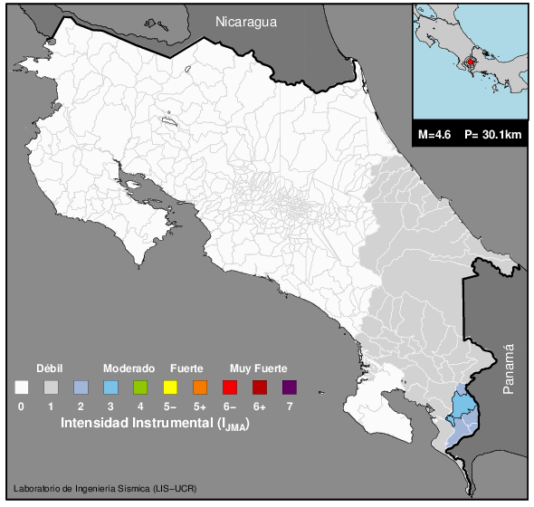 Este mapa muestra la división política de Costa Rica a nivel de distritos. Según nuestros cálculos, la intensidad de grado 3 o superior en la escala de JMA (que varía de 0 a 7) afectó un total de 1 distritos. La lista de estos se muestra bajo del mapa en orden alfabético.
