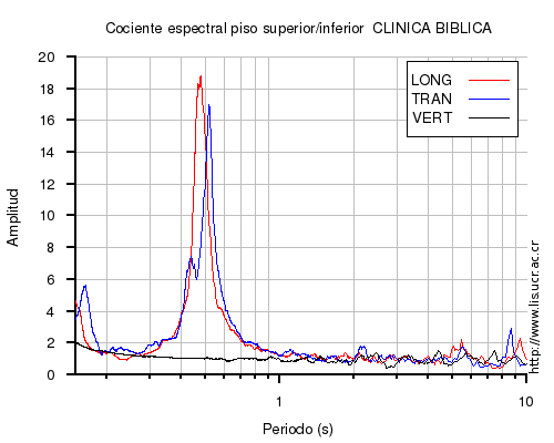 También se muestra el cociente espectral (en el rango de 0.1 a 10 s) entre el nivel superior (sea el último piso o la azotea) e inferior (sea el primero piso o el sótano) para cada una de las componentes LONG=longitudinal, TRAN=transversal y VERT=vertical. En los casos en que el nivel superior o inferior no estén disponibles al momento del sismo, se muestra una imagen con la leyenda "No se pudo calcular".