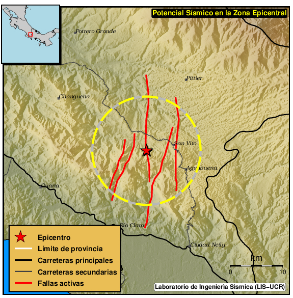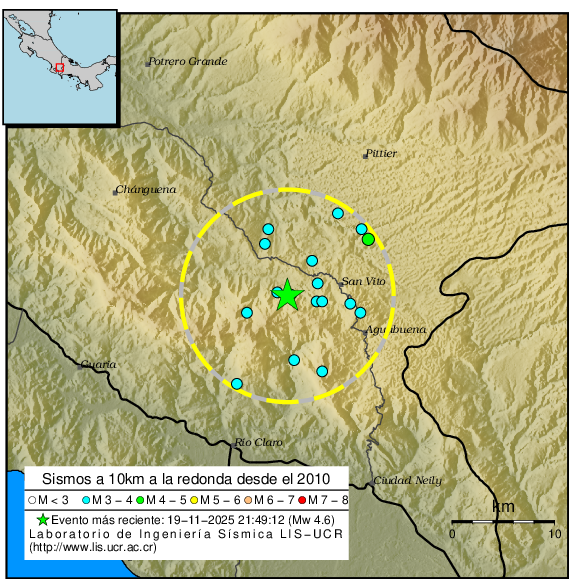 El sismo de mayor magnitud ha sido el del 17-05-2021 a las 15:02:01 con M4.4. Dentro del perímetro viven 24716 personas y el lugar más poblado es San Vito de Coto Brus con 14839 habitantes.