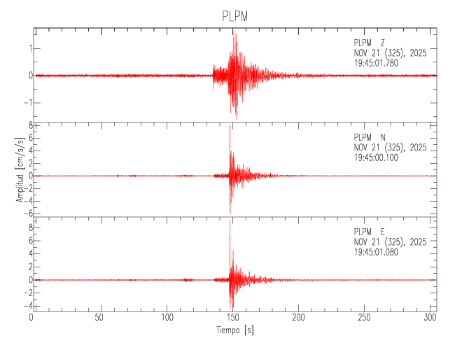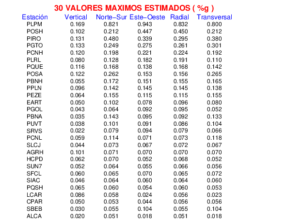 La siguiente tabla muestra los datos de aceleración máxima para cada componente en porcentaje de la aceleración de la gravedad (%g). Estos se obtienen dividiendo el valor del PGA registrado por 980 cm/s2 y multiplicándolo por 100. Los valores de las últimas dos columnas corresponden a la componente radial y transversal. Los datos se listan en orden descendente según el valor de la componente radial.