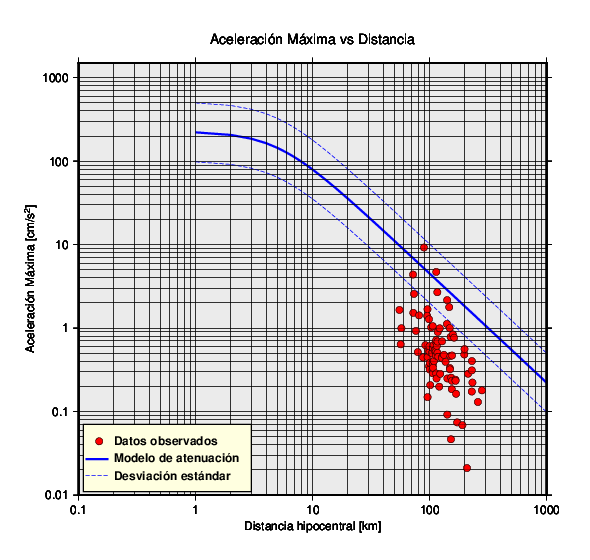 Datos del valor de la aceleración máxima (PGA por sus siglas en inglés) de cada estación (puntos rojos) en función de la distancia al hipocentro. Las trazas azules corresponden al modelo de atenuación y su respectiva desviación estándar.