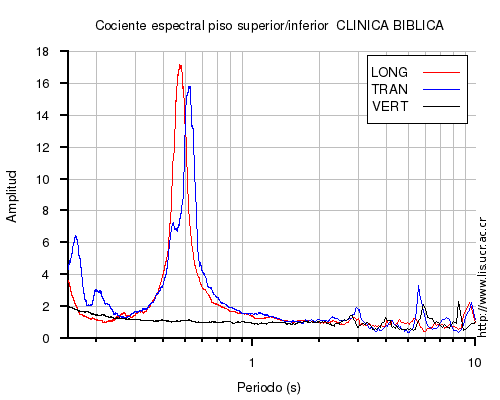 También se muestra el cociente espectral (en el rango de 0.1 a 10 s) entre el nivel superior (sea el último piso o la azotea) e inferior (sea el primero piso o el sótano) para cada una de las componentes LONG=longitudinal, TRAN=transversal y VERT=vertical. En los casos en que el nivel superior o inferior no estén disponibles al momento del sismo, se muestra una imagen con la leyenda "No se pudo calcular".