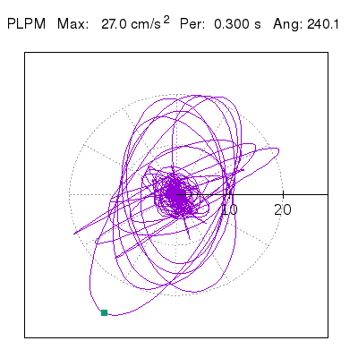 Tomando el periodo en el cual se presenta la amplitud máxima del espectro de respuesta máxima para cada estación, se representa la respuesta bidireccional en función del tiempo sobre el plano horizontal. Se identifica el punto (color verde en cada figura) del cual se desprende la orientación mostrada en el mapa de la sección superior. El valor de la acelereración máxima corresponde al punto del espectro de respuesta para el periodo indicado.