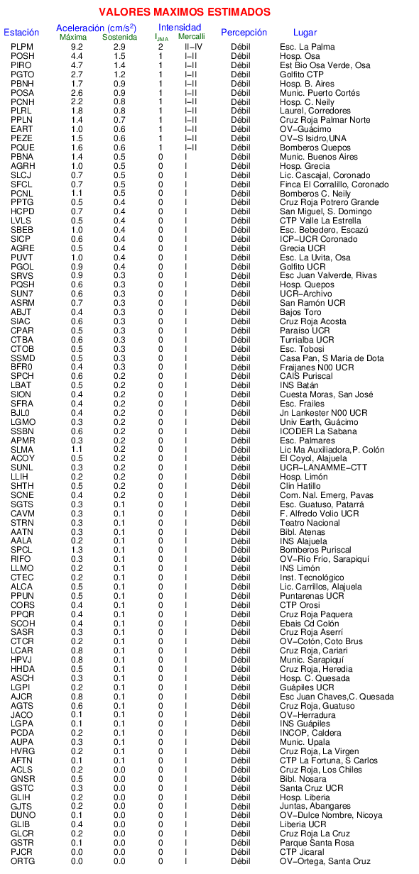La siguiente tabla muestra los valores de Aceleración Máxima o aceleración pico (PGA por sus siglas en inglés). Este es el valor máximo en cualquiera de las 3 componentes del registro.