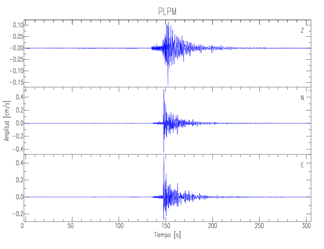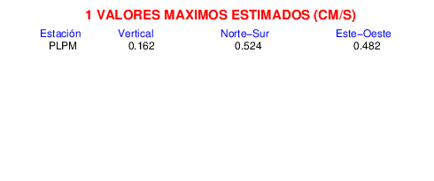 Los registros de velocidad se obtienen de la integración de los datos de aceleración. Esta tabla contiene los valores de velocidad máxima (PGV por sus siglas en inglés) para cada componente en cm/s. Las estaciones se listan en orden alfabético y corresponden a los sitios en que el nivel de aceleración fue superior a los 5 cm/s2.