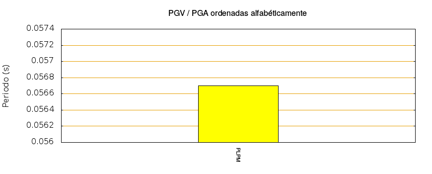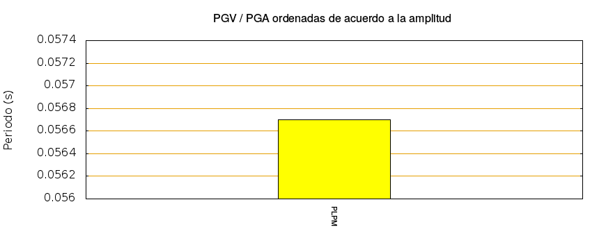 El cociente de la velocidad máxima (PGV) entre la aceleración máxima (PGA) brinda información de los periodos más significativos del movimiento del suelo. En el gráfico siguiente se muestran las estaciones ordenadas por su cercanía al epicentro. La más cercana está a la izquierda y la más lejana a la derecha. También se muestran los mismos datos en orden alfabético y ordenados de mayor a menor amplitud.
