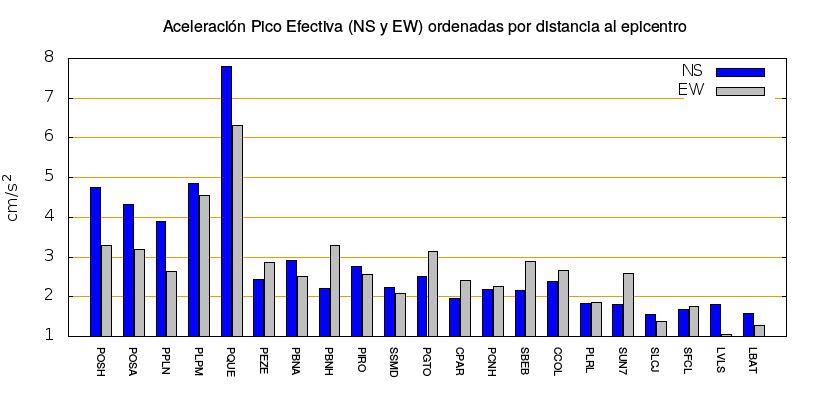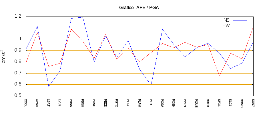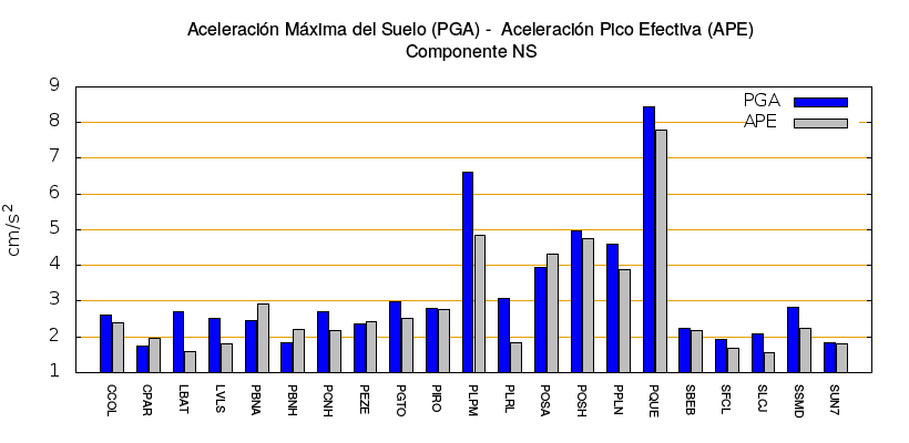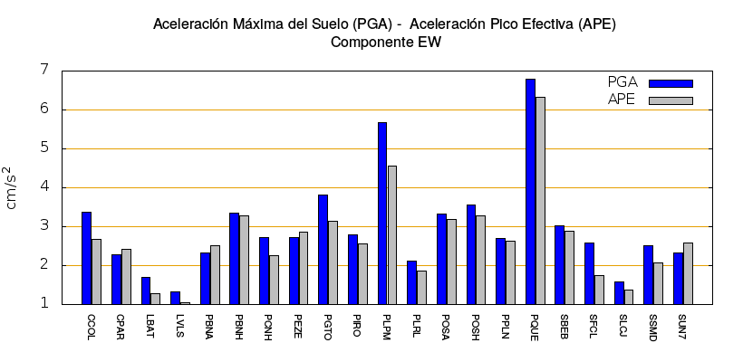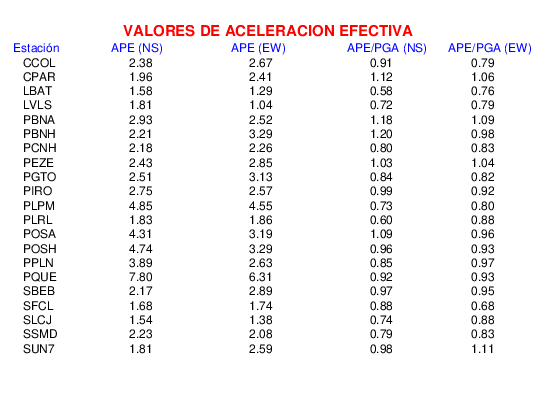 La siguiente tabla muestra los valores de aceleración efectiva para las componentes norte-sur (NS) y este-oeste (EW). También se muestra el valor del cociente entre la aceleración efectiva y la aceleración máxima (APE/PGA).