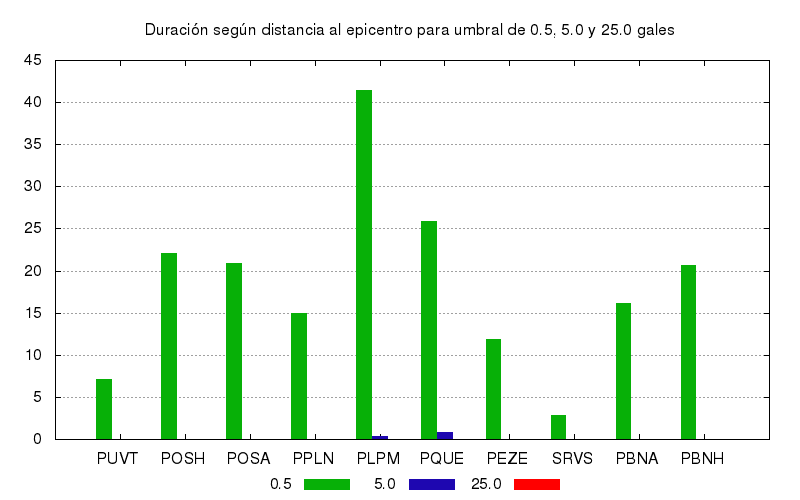La duración para otros niveles de aceleración también se calculó. Este es el gráfico con los valores de duración para umbrales de 0.5, 5.0 y 25.0 gales. Se muestran los 10 primeros sitios ordenados por su cercanía el epicentro.