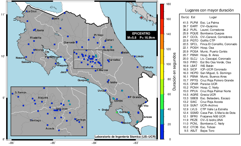 Este mapa muestra la duración en cada sitio de registro del LISUCR. Este parámetro se calculó sumando el tiempo que la amplitud del registro se mantuvo por encima de 0.5 cm/2. La tabla detalla el valor de los primeros 30 sitios con el código de la estación y el nombre del lugar donde se ubica.
