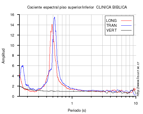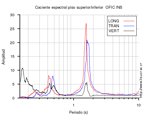 También se muestra el cociente espectral (en el rango de 0.1 a 10 s) entre el nivel superior (sea el último piso o la azotea) e inferior (sea el primero piso o el sótano) para cada una de las componentes LONG=longitudinal, TRAN=transversal y VERT=vertical. En los casos en que el nivel superior o inferior no estén disponibles al momento del sismo, se muestra una imagen con la leyenda "No se pudo calcular".
