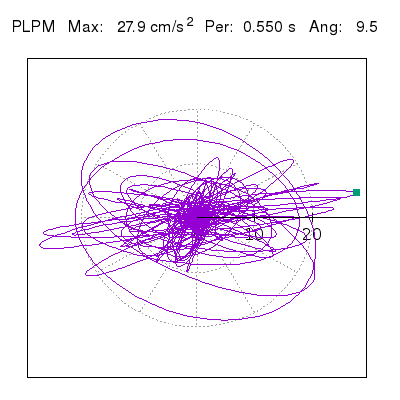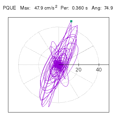 Tomando el periodo en el cual se presenta la amplitud máxima del espectro de respuesta máxima para cada estación, se representa la respuesta bidireccional en función del tiempo sobre el plano horizontal. Se identifica el punto (color verde en cada figura) del cual se desprende la orientación mostrada en el mapa de la sección superior. El valor de la acelereración máxima corresponde al punto del espectro de respuesta para el periodo indicado.