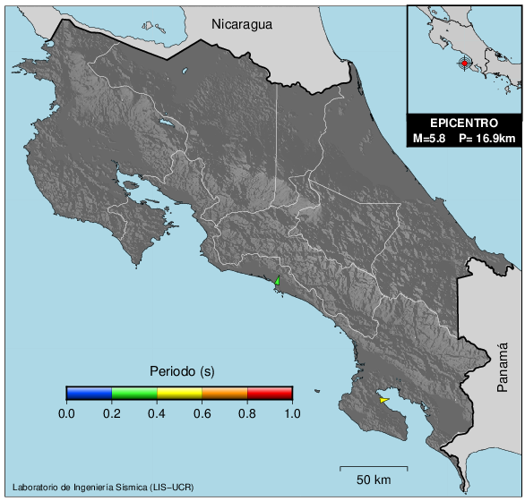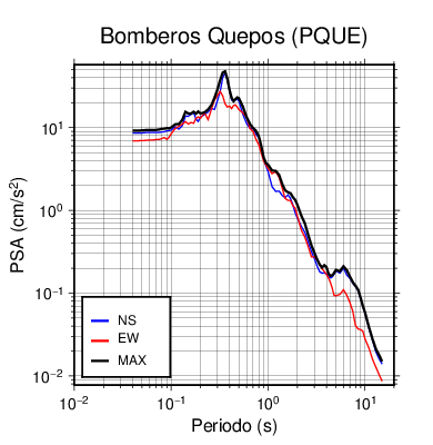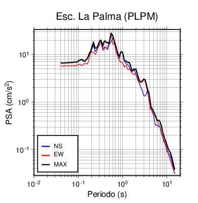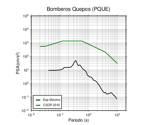 En los siguientes gráficos, la traza verde es el espectro propuesto por el CSCR-2010, la traza negra es el espectro máximo de este sismo. El valor de la amplitud está dado en pseudoaceleración en cm/s2.