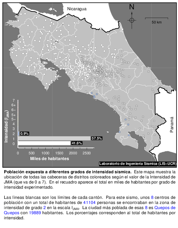 Cada punto sobre el mapa es la cabecera de un distrito. El número de habitantes que hay en cada uno se suma si se encuentra dentro de una misma zona de intensidad sísmica y el total se muestra en el recuadro en manera de porcentajes del total de la población y en miles de habitantes.