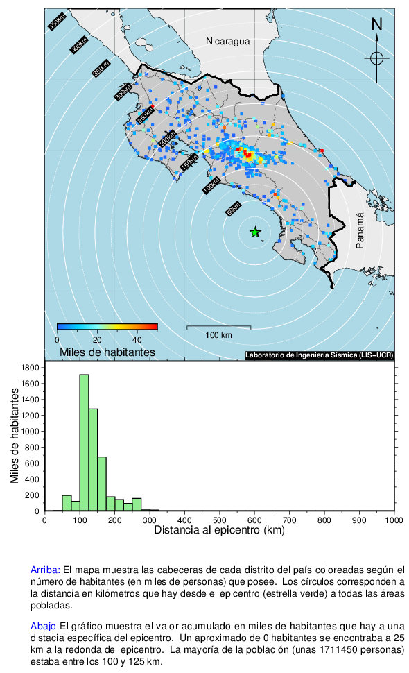 Este mapa muestra la ubicación del epicentro y la cantidad de habitantes que se encontraban a una cierta distancia de este. Los intervalos son de 25 km.