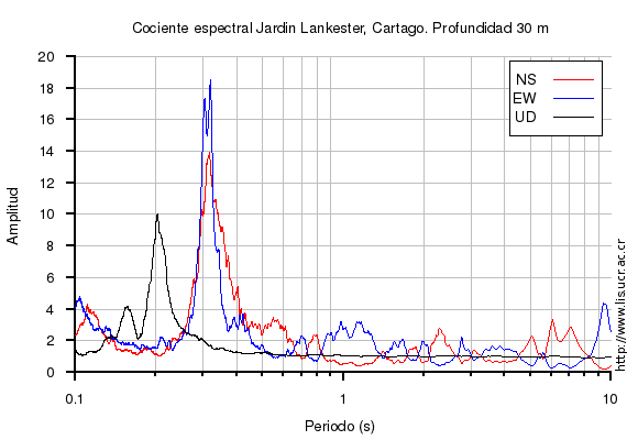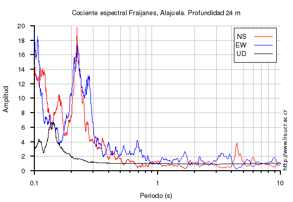 El cociente espectral se obtuvo dividiendo el espectro de amplitud de la componente en superficie con respecto a la componente en profundidad (NS=norte-sur, EW=este-oeste, UD=vertical)