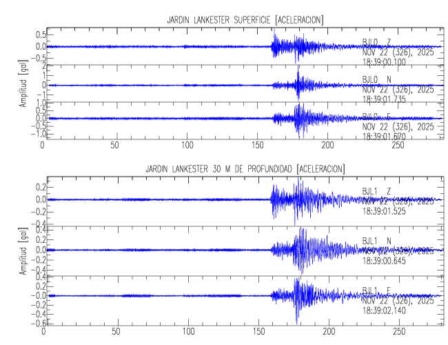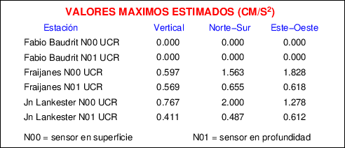 Aquí se muestran las formas de onda y cocientes espectrales de los sensores colocados en pozo . Uno se ubica en el Jardín Lankester en Paraíso de Cartago con 30 m de profundidad y el otro en la Estación Experimental Fabio Baudrit en Alajuela con 40 m de profundidad. La tabla muestra los valores de aceleración máxima (PGA) leídos de las tres componentes en superficie (N00) y en profundidad (N01)