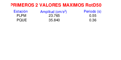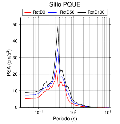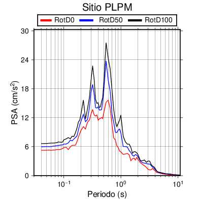 RotD50 representa un valor medio de la respuesta por lo cual se puede comparar con valores de otras medidas empleadas en modelos de atenuación como la Media Geométrica de las componentes ortogonales (GM). RotD0 y RotD100 son los valores extremos (mínimo y máximo), los cuales nos pueden servir para determinar la dispersión de la posible respuesta en cada sitio.