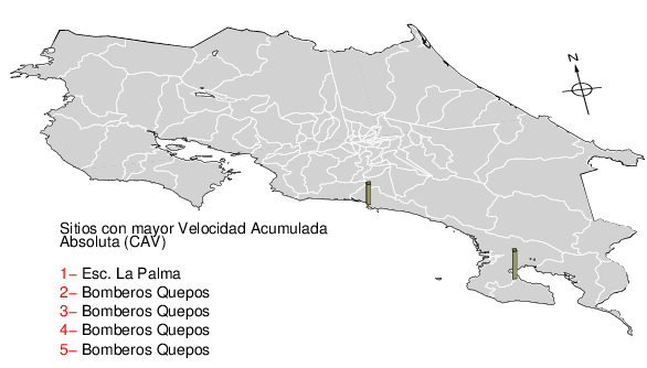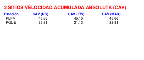 La velocidad acumulada absoluta (CAV por sus siglas en inglés) es otro parámetro que se usa para caracterizar el movimiento fuerte del suelo. Los datos están dados en cm/s para las componentes norte-sur (NS) y este-oeste (EW). El máximo de ambas se da en la tercera columna.