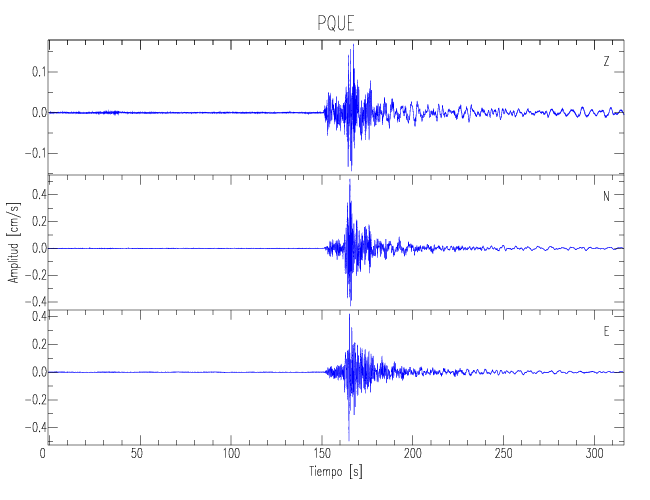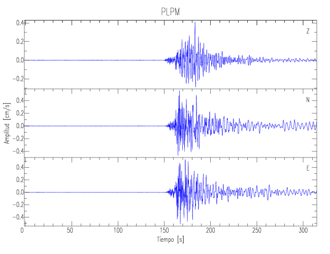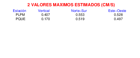 Los registros de velocidad se obtienen de la integración de los datos de aceleración. Esta tabla contiene los valores de velocidad máxima (PGV por sus siglas en inglés) para cada componente en cm/s. Las estaciones se listan en orden alfabético y corresponden a los sitios en que el nivel de aceleración fue superior a los 5 cm/s2.