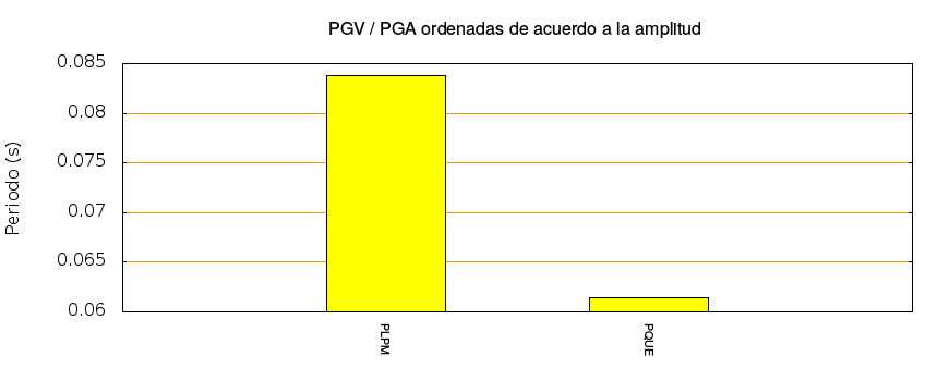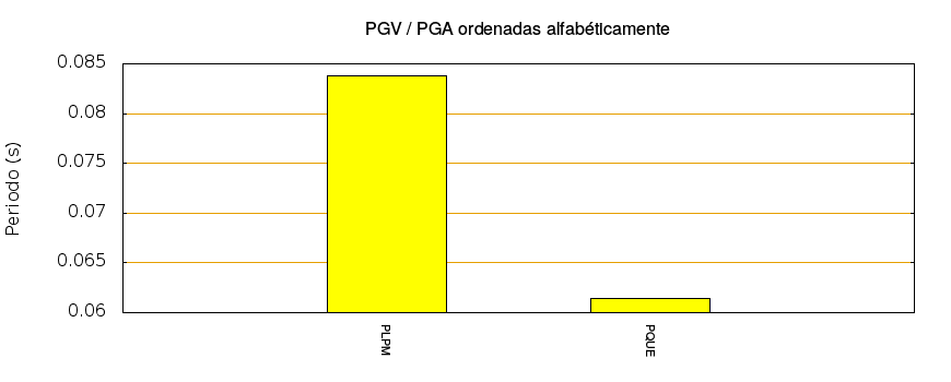 El cociente de la velocidad máxima (PGV) entre la aceleración máxima (PGA) brinda información de los periodos más significativos del movimiento del suelo. En el gráfico siguiente se muestran las estaciones ordenadas por su cercanía al epicentro. La más cercana está a la izquierda y la más lejana a la derecha. También se muestran los mismos datos en orden alfabético y ordenados de mayor a menor amplitud.
