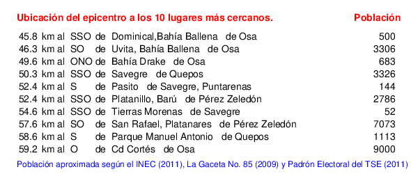 Detalle de la zona epicentral:. Se muestran los poblados más cercanos al epicentro en un radio de unos 30 km. Las principales fallas activas son las trazas de color rojo. Abajo están las distancias que hay del epicentro a cada uno de los diez sitios más cercanos y la cantidad de habitantes que poseen.