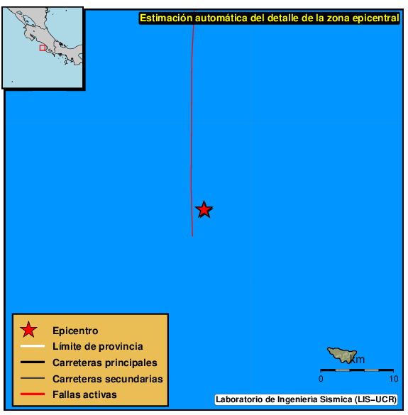 Mapa del epicentro: Los triángulos verdes son las estaciones acelerográficas usadas para calcular el epicentro que se muestra como un punto amarillo. El detalle de la magnitud y distancia a San José se muestra en el cuadro inserto en el mapa.