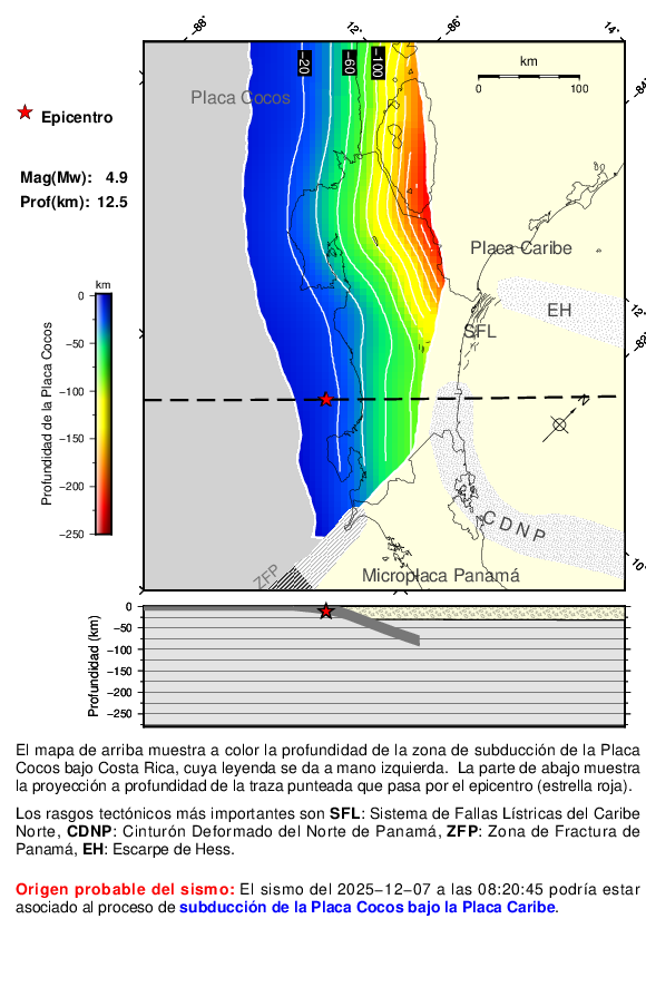 Origen del sismo: Este mapa muestra el marco tectónico de Costa Rica. El mapa se ha rotado para que el corte horizontal (línea punteada que corta el epicentro) que se muestra sobre el mapa se proyecte de manera proporcional en la figura de abajo. Los diferentes colores corresponden a la profundidad de la Placa Cocos bajo la Placa Caribe.