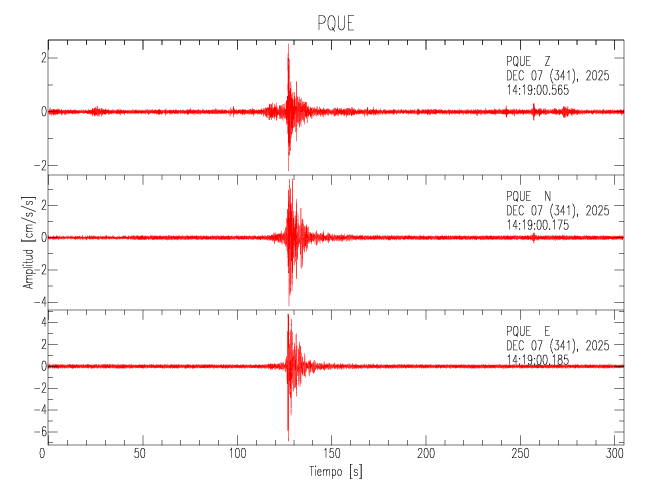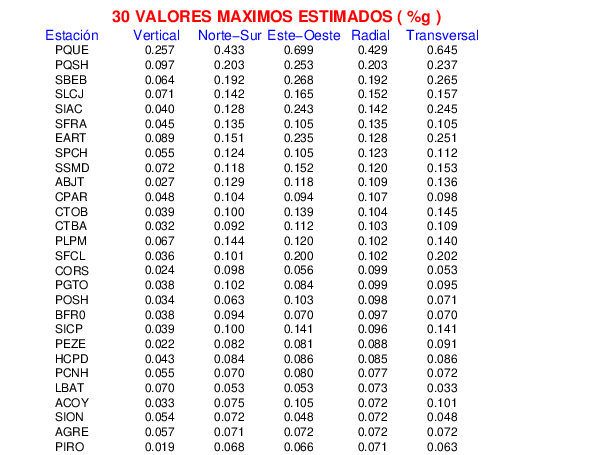 La siguiente tabla muestra los datos de aceleración máxima para cada componente en porcentaje de la aceleración de la gravedad (%g). Estos se obtienen dividiendo el valor del PGA registrado por 980 cm/s2 y multiplicándolo por 100. Los valores de las últimas dos columnas corresponden a la componente radial y transversal. Los datos se listan en orden descendente según el valor de la componente radial.