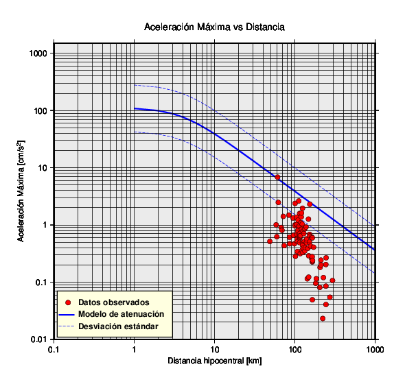Datos del valor de la aceleración máxima (PGA por sus siglas en inglés) de cada estación (puntos rojos) en función de la distancia al hipocentro. Las trazas azules corresponden al modelo de atenuación y su respectiva desviación estándar.