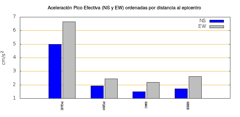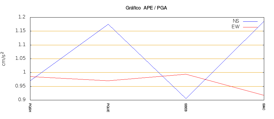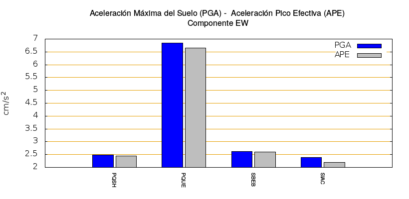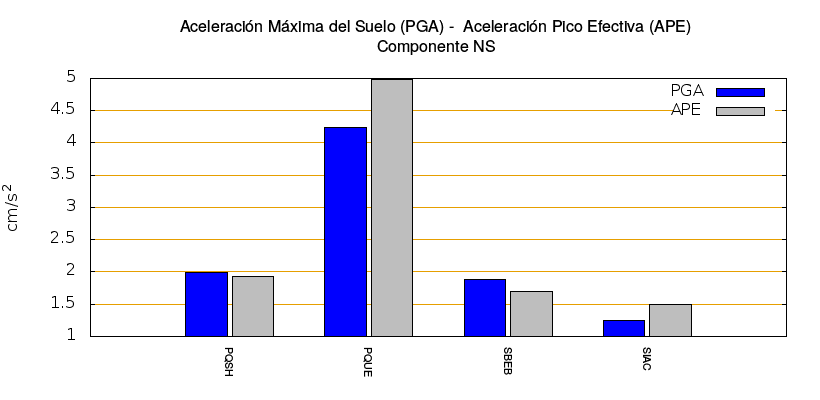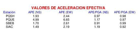 La siguiente tabla muestra los valores de aceleración efectiva para las componentes norte-sur (NS) y este-oeste (EW). También se muestra el valor del cociente entre la aceleración efectiva y la aceleración máxima (APE/PGA).