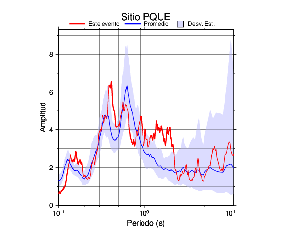 Los resultados que se presentan aquí fueron obtenidos luego de dividir las componentes horizontales entre la componente vertical (conocido como técnica H/V). Se grafica tanto el efecto de sitio del sismo registrado como el valor promedio en cada estación y su correspondiente desviación estándar.