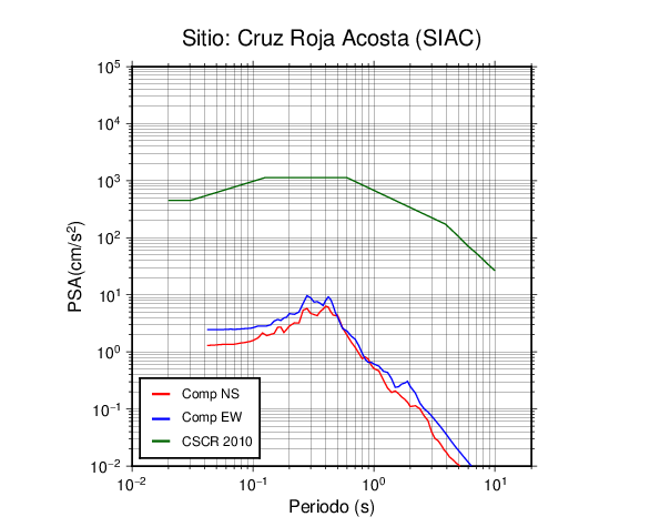En los siguientes gráficos, la traza verde es el espectro propuesto por el CSCR-2010, la traza roja es el espectro de este sismo en la componente norte-sur (NS) y la traza azul la componente este-oeste (EW). El valor de la amplitud está dado en pseudoaceleración en cm/s2.