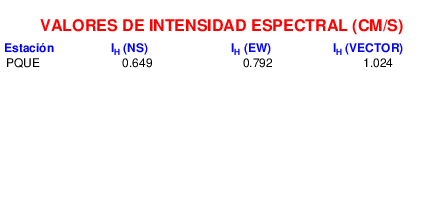 En esta sección se muestra el cáculo de la intensidad de Housner, IH para la componente norte-sur (NS) y este-oeste (EW) y la suma vectorial de los registros de aceleración que tuvieron valores superiores a los 5 cm/s2.
