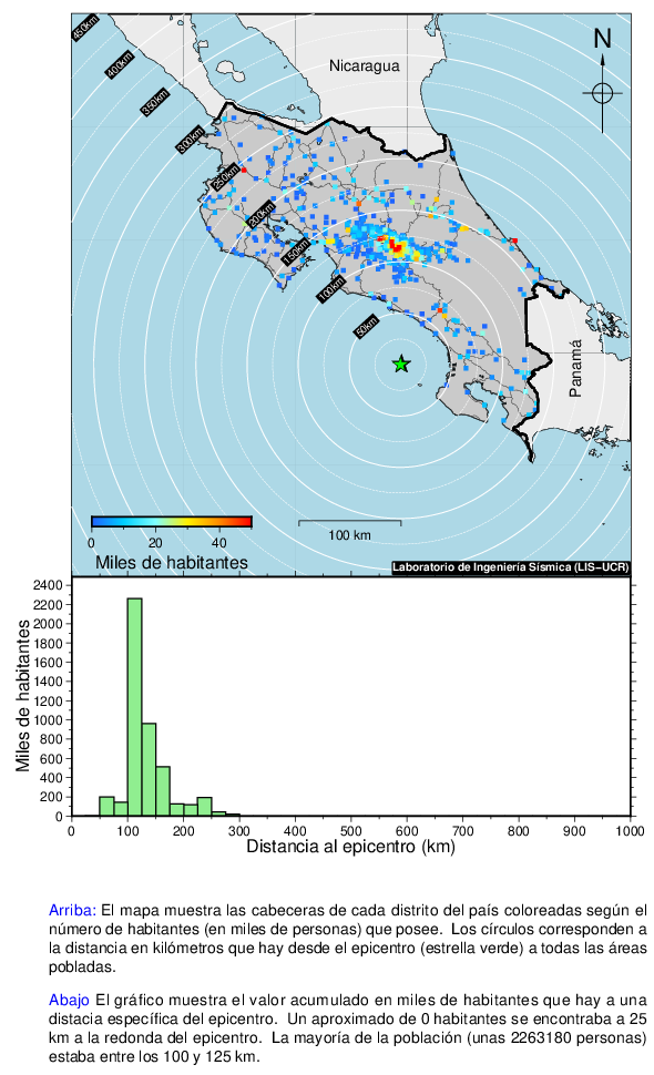 Este mapa muestra la ubicación del epicentro y la cantidad de habitantes que se encontraban a una cierta distancia de este. Los intervalos son de 25 km.