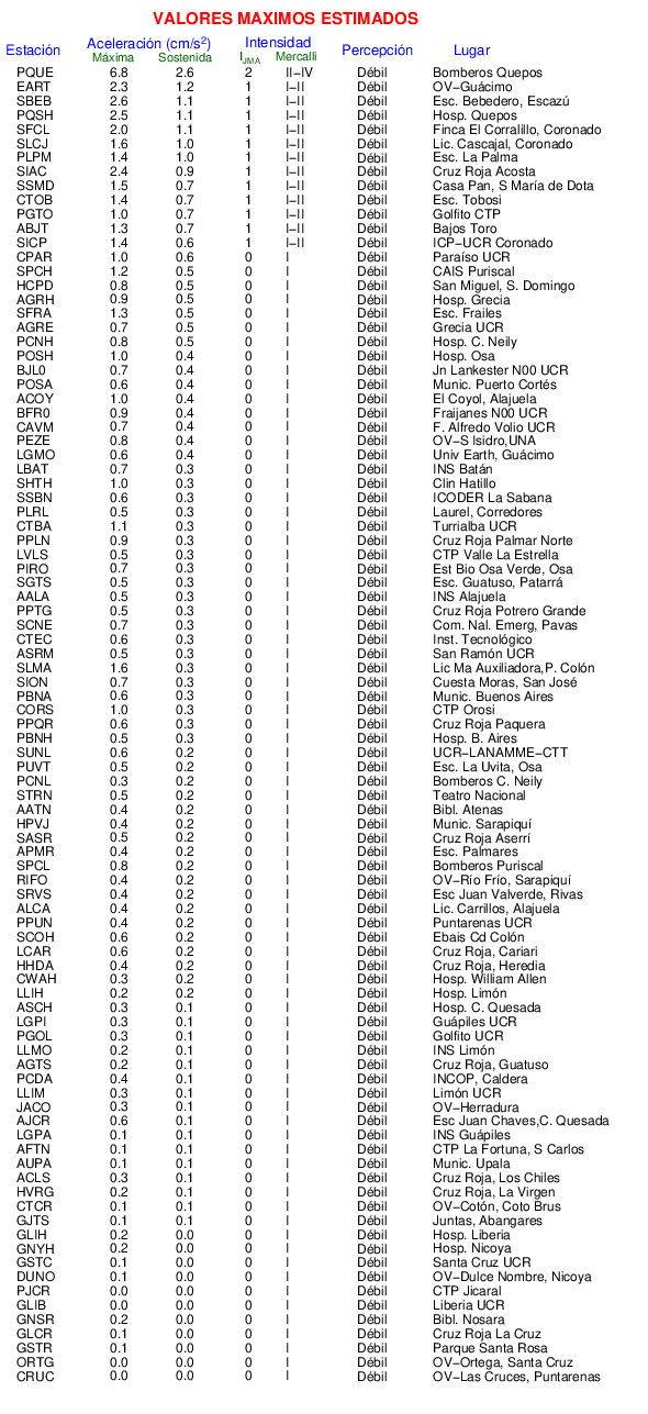 La siguiente tabla muestra los valores de Aceleración Máxima o aceleración pico (PGA por sus siglas en inglés). Este es el valor máximo en cualquiera de las 3 componentes del registro.