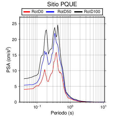 RotD50 representa un valor medio de la respuesta por lo cual se puede comparar con valores de otras medidas empleadas en modelos de atenuación como la Media Geométrica de las componentes ortogonales (GM). RotD0 y RotD100 son los valores extremos (mínimo y máximo), los cuales nos pueden servir para determinar la dispersión de la posible respuesta en cada sitio.