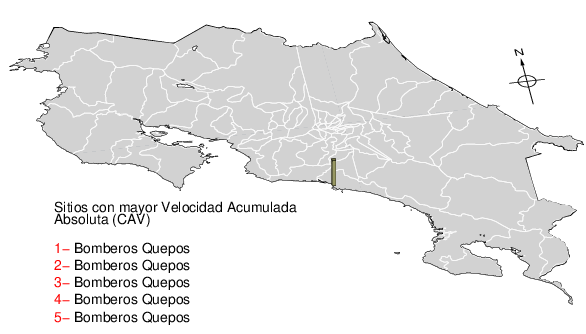 La velocidad acumulada absoluta (CAV por sus siglas en inglés) es otro parámetro que se usa para caracterizar el movimiento fuerte del suelo. Los datos están dados en cm/s para las componentes norte-sur (NS) y este-oeste (EW). El máximo de ambas se da en la tercera columna.