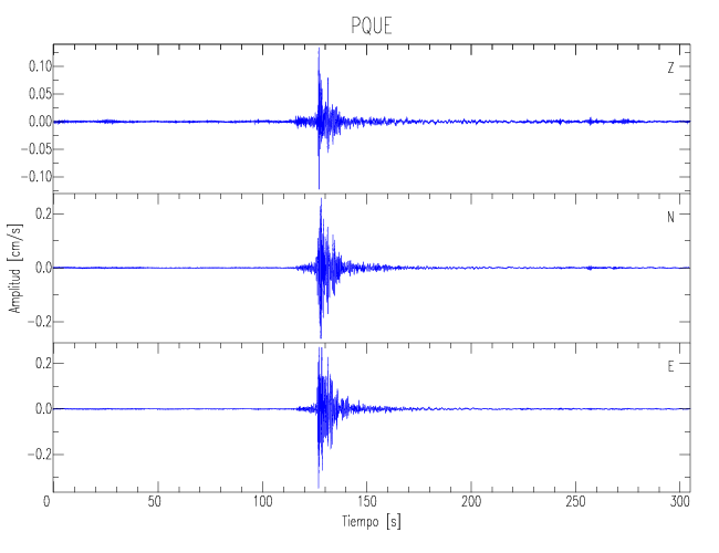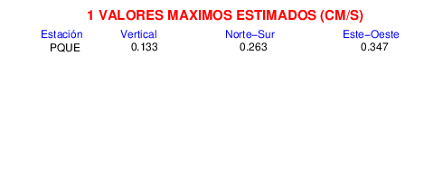 Los registros de velocidad se obtienen de la integración de los datos de aceleración. Esta tabla contiene los valores de velocidad máxima (PGV por sus siglas en inglés) para cada componente en cm/s. Las estaciones se listan en orden alfabético y corresponden a los sitios en que el nivel de aceleración fue superior a los 5 cm/s2.