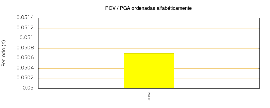 El cociente de la velocidad máxima (PGV) entre la aceleración máxima (PGA) brinda información de los periodos más significativos del movimiento del suelo. En el gráfico siguiente se muestran las estaciones ordenadas por su cercanía al epicentro. La más cercana está a la izquierda y la más lejana a la derecha. También se muestran los mismos datos en orden alfabético y ordenados de mayor a menor amplitud.