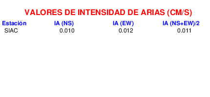 En esta sección se muestra el cáculo de la IA para la componente norte-sur (NS) y este-oeste (EW) de los registros de aceleración que tuvieron valores superiores a los 5 cm/s2, así como el valor total de esta que corresponde al promedio de ambas componentes horizontales.