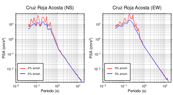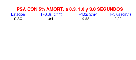 Esta tabla contiene los valores de PSA en cm/s2 calculados del espectro de respuesta con 5% de amortiguamiento a 1 segundo (se muestran los valores para aquellas estaciones que tuvieron un valor de aceleración superior a 5 cm/s2).