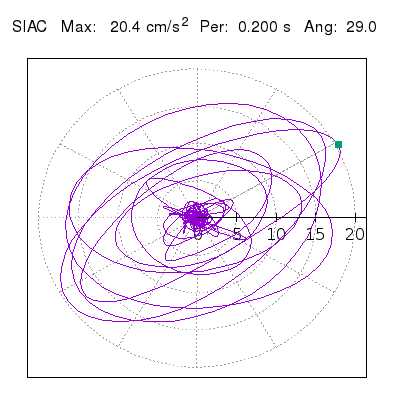 Tomando el periodo en el cual se presenta la amplitud máxima del espectro de respuesta máxima para cada estación, se representa la respuesta bidireccional en función del tiempo sobre el plano horizontal. Se identifica el punto (color verde en cada figura) del cual se desprende la orientación mostrada en el mapa de la sección superior. El valor de la acelereración máxima corresponde al punto del espectro de respuesta para el periodo indicado.