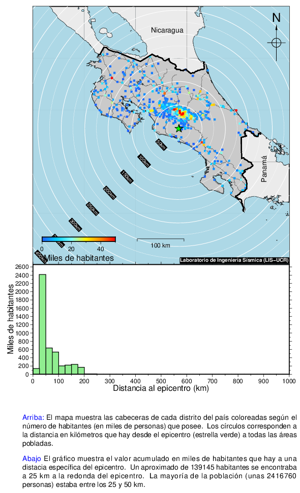 Este mapa muestra la ubicación del epicentro y la cantidad de habitantes que se encontraban a una cierta distancia de este. Los intervalos son de 25 km.