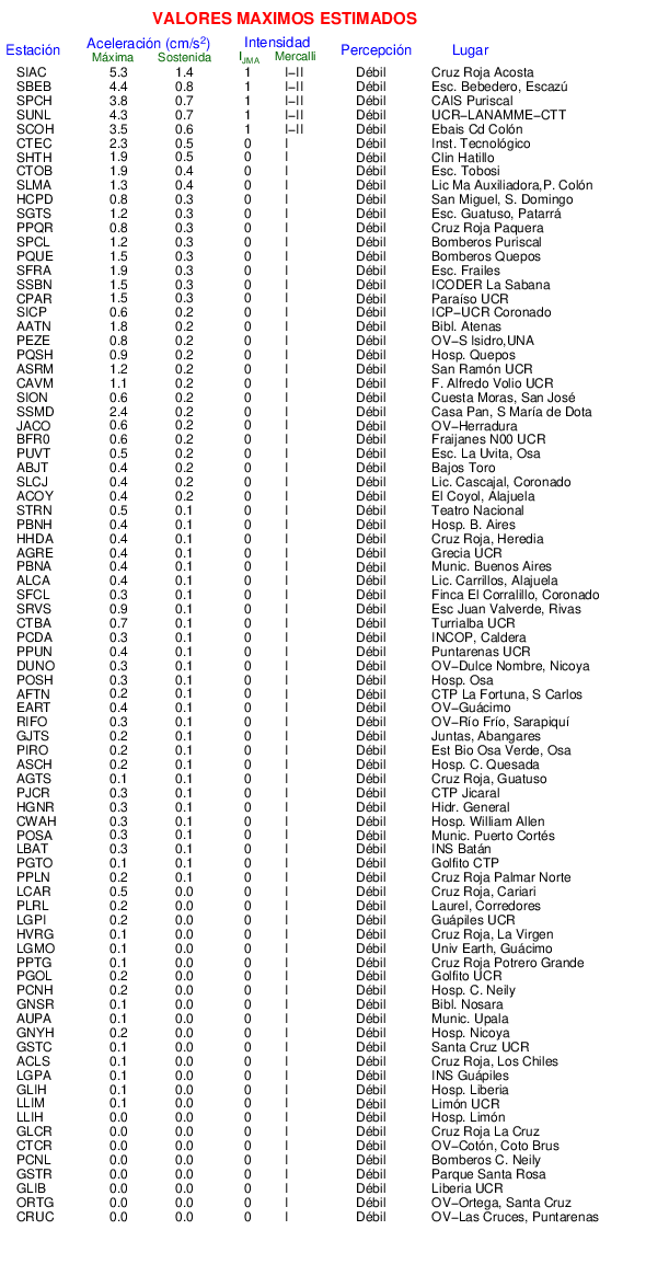 La siguiente tabla muestra los valores de Aceleración Máxima o aceleración pico (PGA por sus siglas en inglés). Este es el valor máximo en cualquiera de las 3 componentes del registro.