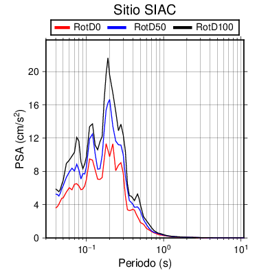RotD50 representa un valor medio de la respuesta por lo cual se puede comparar con valores de otras medidas empleadas en modelos de atenuación como la Media Geométrica de las componentes ortogonales (GM). RotD0 y RotD100 son los valores extremos (mínimo y máximo), los cuales nos pueden servir para determinar la dispersión de la posible respuesta en cada sitio.