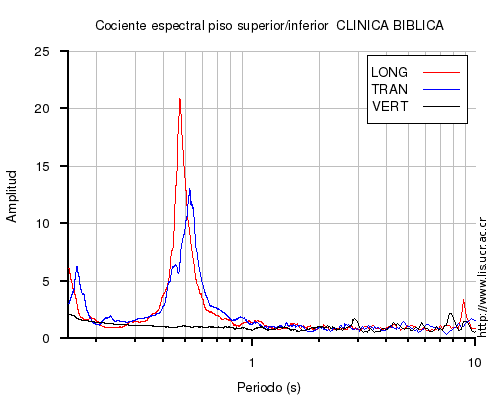 También se muestra el cociente espectral (en el rango de 0.1 a 10 s) entre el nivel superior (sea el último piso o la azotea) e inferior (sea el primero piso o el sótano) para cada una de las componentes LONG=longitudinal, TRAN=transversal y VERT=vertical. En los casos en que el nivel superior o inferior no estén disponibles al momento del sismo, se muestra una imagen con la leyenda "No se pudo calcular".
