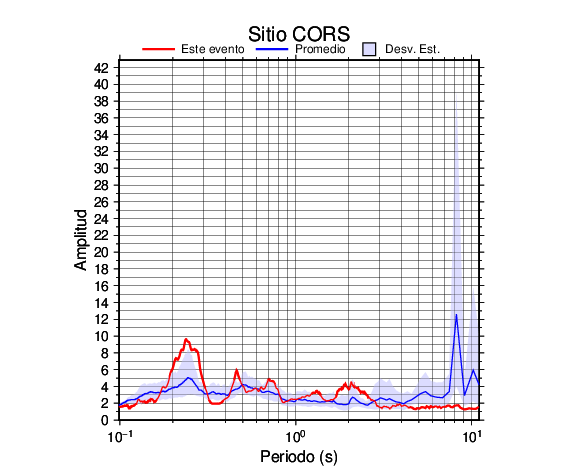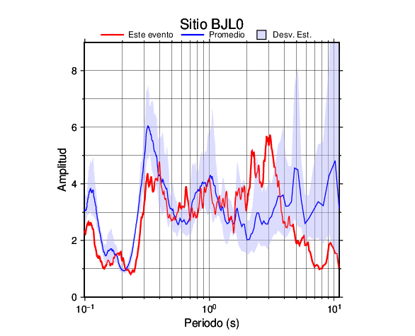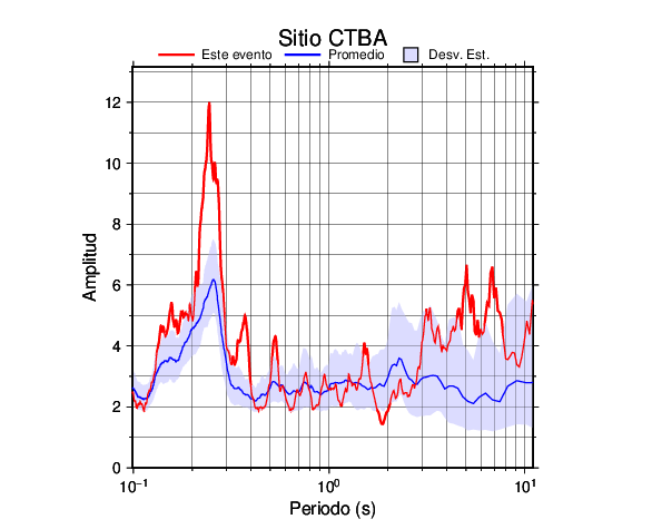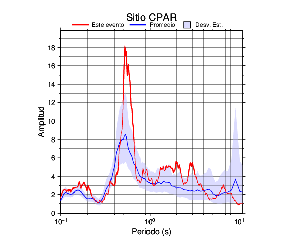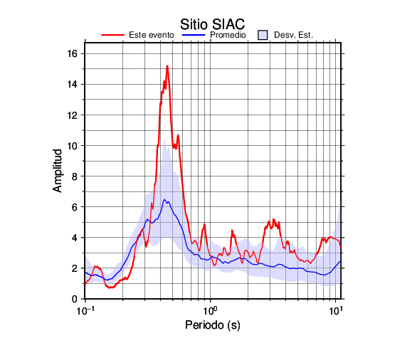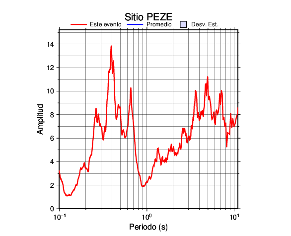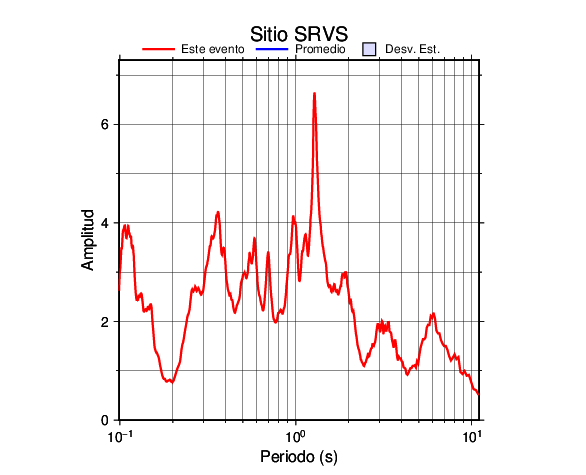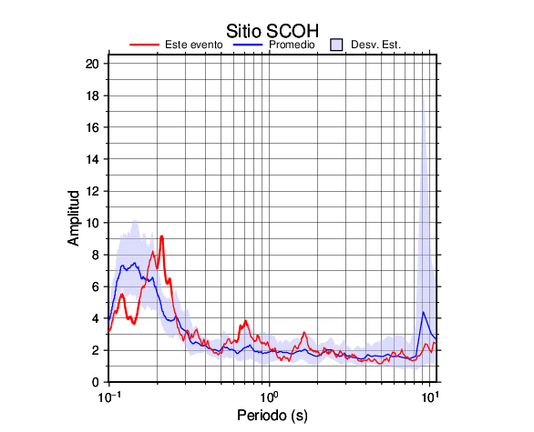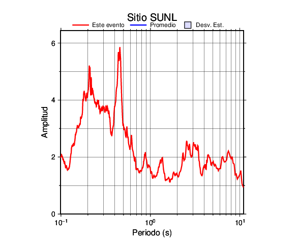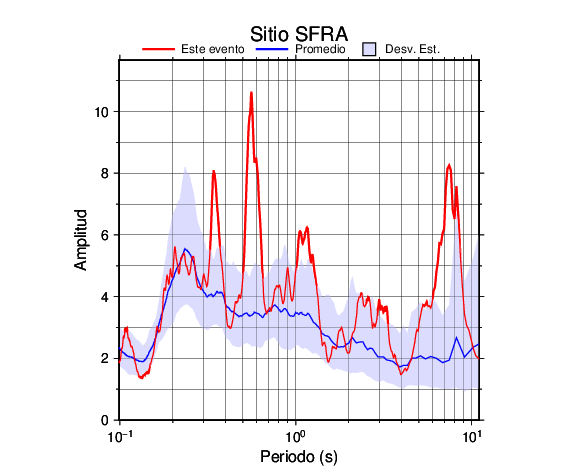 Los resultados que se presentan aquí fueron obtenidos luego de dividir las componentes horizontales entre la componente vertical (conocido como técnica H/V). Se grafica tanto el efecto de sitio del sismo registrado como el valor promedio en cada estación y su correspondiente desviación estándar.