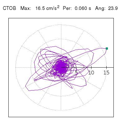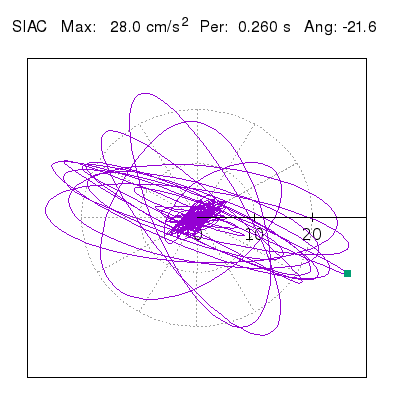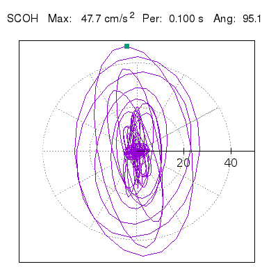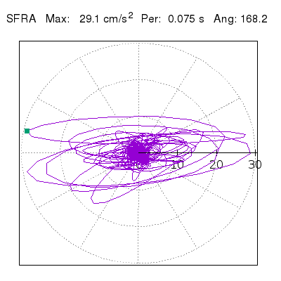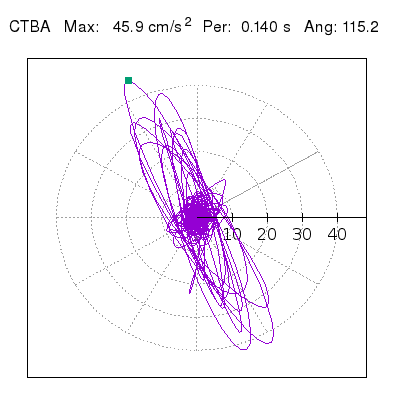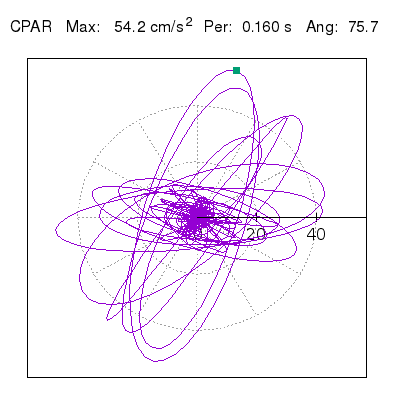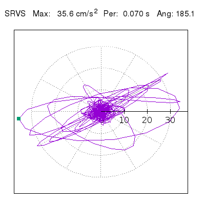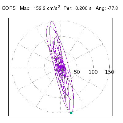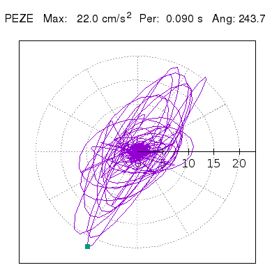 Tomando el periodo en el cual se presenta la amplitud máxima del espectro de respuesta máxima para cada estación, se representa la respuesta bidireccional en función del tiempo sobre el plano horizontal. Se identifica el punto (color verde en cada figura) del cual se desprende la orientación mostrada en el mapa de la sección superior. El valor de la acelereración máxima corresponde al punto del espectro de respuesta para el periodo indicado.