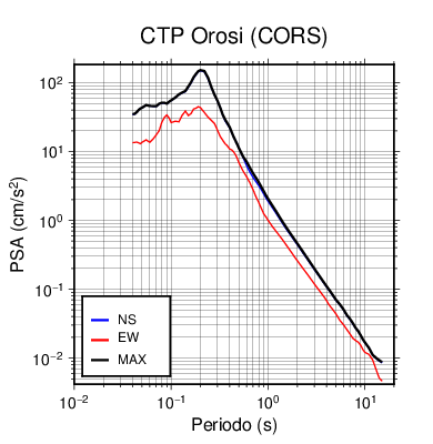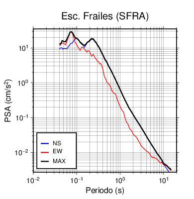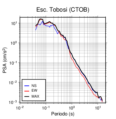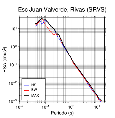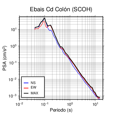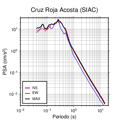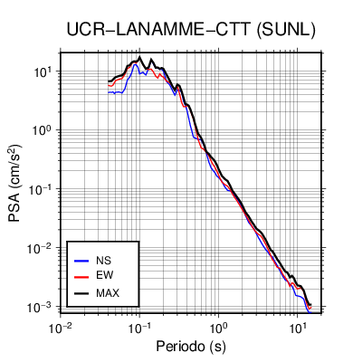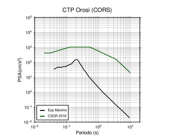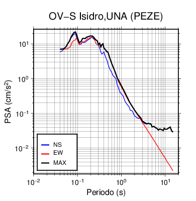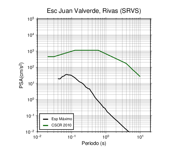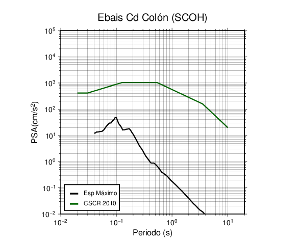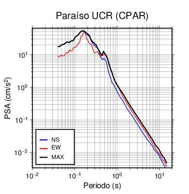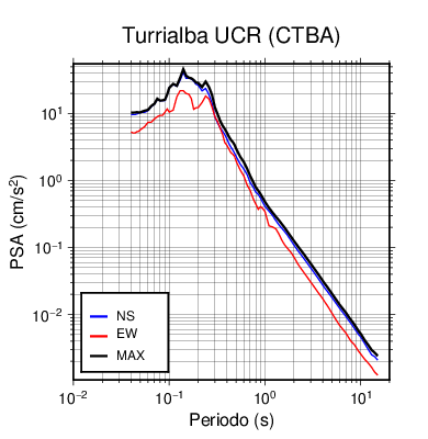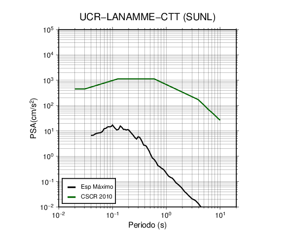 En los siguientes gráficos, la traza verde es el espectro propuesto por el CSCR-2010, la traza negra es el espectro máximo de este sismo. El valor de la amplitud está dado en pseudoaceleración en cm/s2.