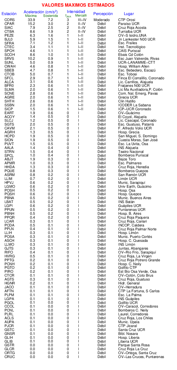 La siguiente tabla muestra los valores de Aceleración Máxima o aceleración pico (PGA por sus siglas en inglés). Este es el valor máximo en cualquiera de las 3 componentes del registro.